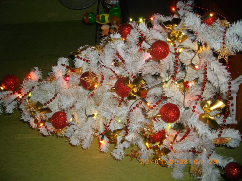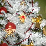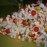 Ši eglutė pirkta praeitais metais. Tad mūsų namučius jau puošia antrus metus.Papuošta raudonom,auksinėm dekoracijomis. Manau dera:)Šiais metais plius dar papuošėm Alinos dovanotais žaisliukais, kaip tik tinka mūsų eglutei:)Po eglute taip pat gyvena keletas gyventojų, kurie saugo padetas dovaneles...Taip ji žyba nakti...... o tokia gražuolė diena.