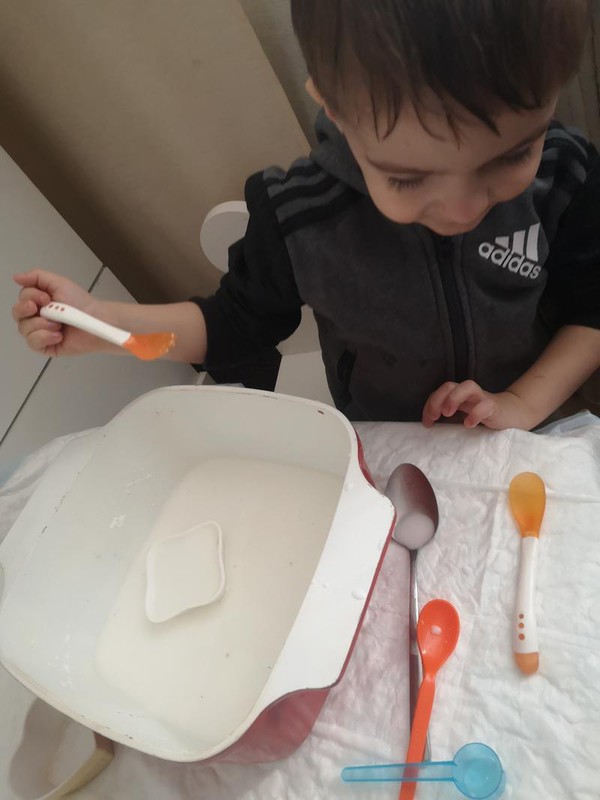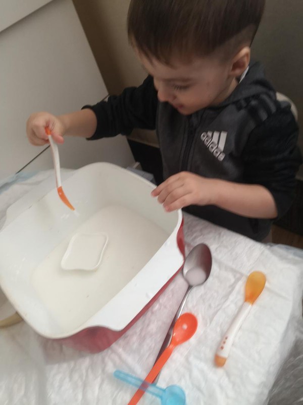 Labai smagi veikla su krakmolu. Reikia krakmolo ir vandens. Pvz santykis 2 stiklinės krakmolo ir stiklinė vandens. Masė gaunasi skysta. Galima padaryti ir spalvota su maistiniais dažais. Šiandien mes tiesiog žaidėme su šaukšteliais. O smagu nardinti gyvūnėlius ir pan. Įjungti fantazija