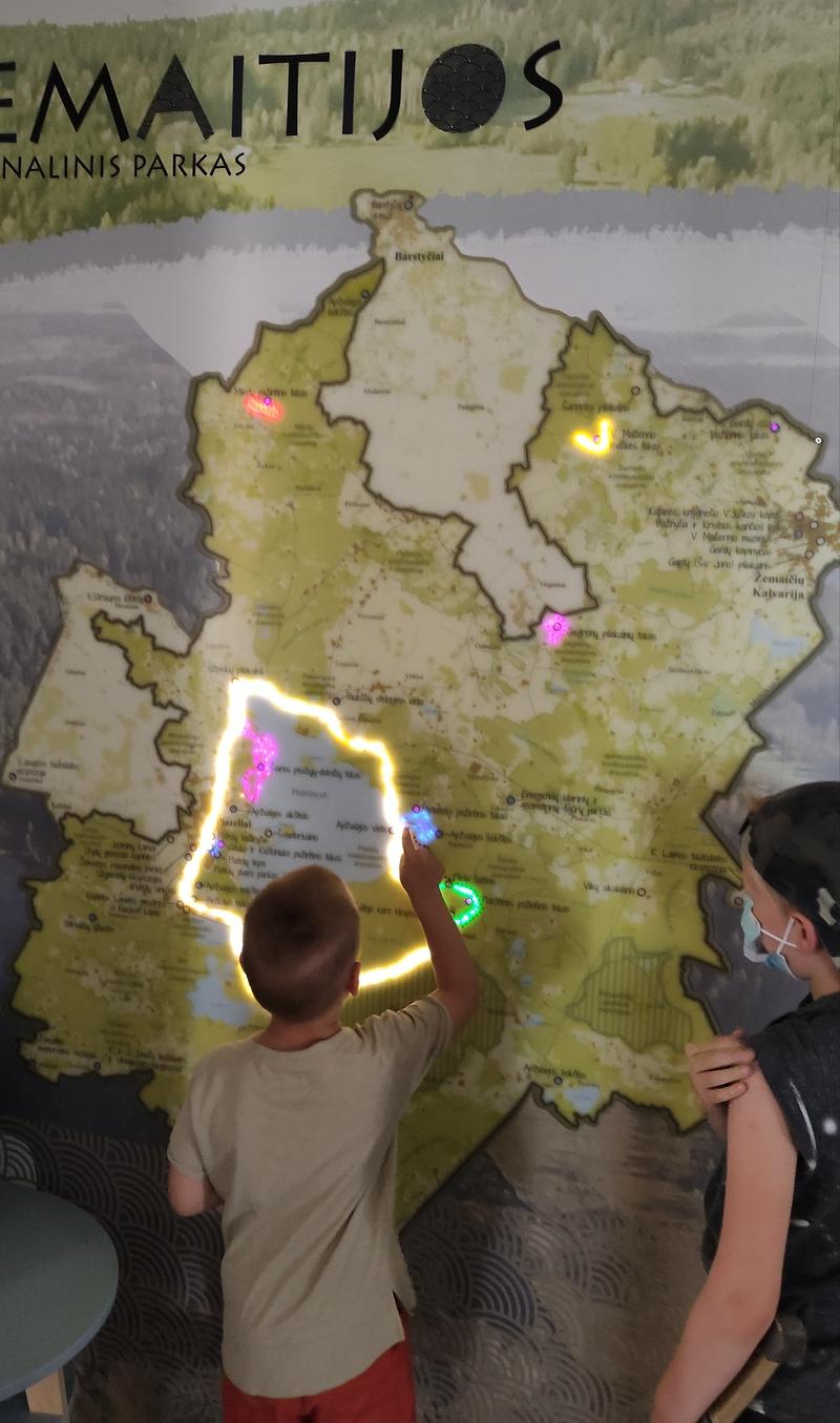 Tik įėjus pasitinka didžiulis Žemaitijos nacionalinio parko žemėlapis, kuriame skirtingomis spalvomis šviečia dviračių takas aplink ežerą, apžvalgos vietos, pažintiniai pėsčiųjų takai ir kt.